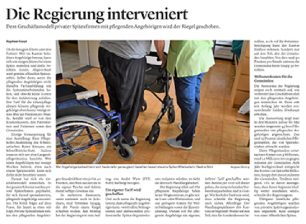 Die Solothurner Zeitung berichtete am 2. September 2025 über den Regierungsratsentscheid zur Anstellung pflegender Angehöriger bei privaten Spitex Organisationen. Der Kanton hat die bisherigen Regelungen angepasst und ein neues Tarifsystem eingeführt.