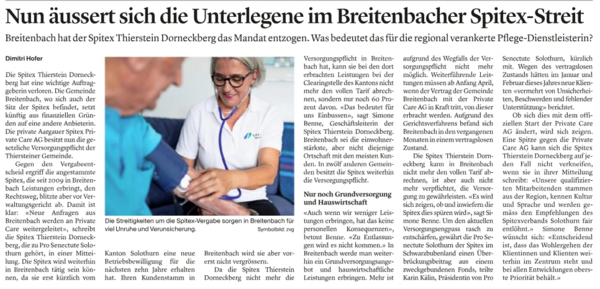 Die Spitex Thierstein Dorneckberg, seit 2009 in Breitenbach tätig, hat überraschend das Mandat der Gemeinde verloren. Künftig übernimmt die Private Care AG die gesetzliche Versorgungspflicht – ein Entscheid, der für uns schwer nachvollziehbar ist, da die Thiersteiner Spitex mit qualifizierten Mitarbeitenden aus der Region, Kenntnis von Kultur und Sprache sowie langjähriger Erfahrung vor Ort arbeitet.